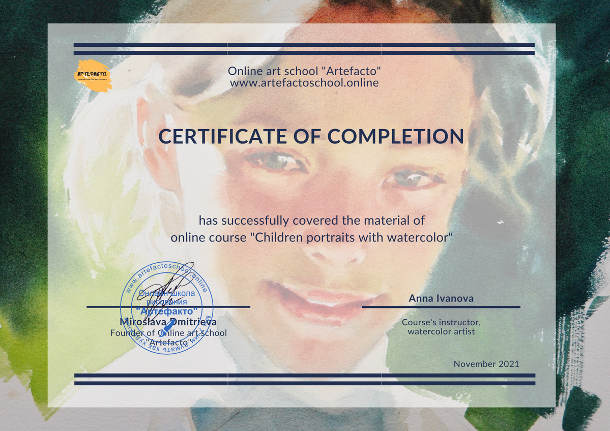 Upon completion of the course for the students of Elite plan we issue a certificate. The certificate could be used as a proof of your qualification's upgrade at work (if it is related to arts) and for your private affairs as a recognition of your mastery in watercolor.
