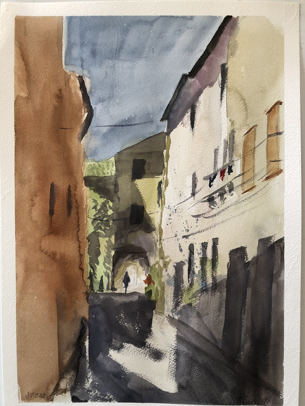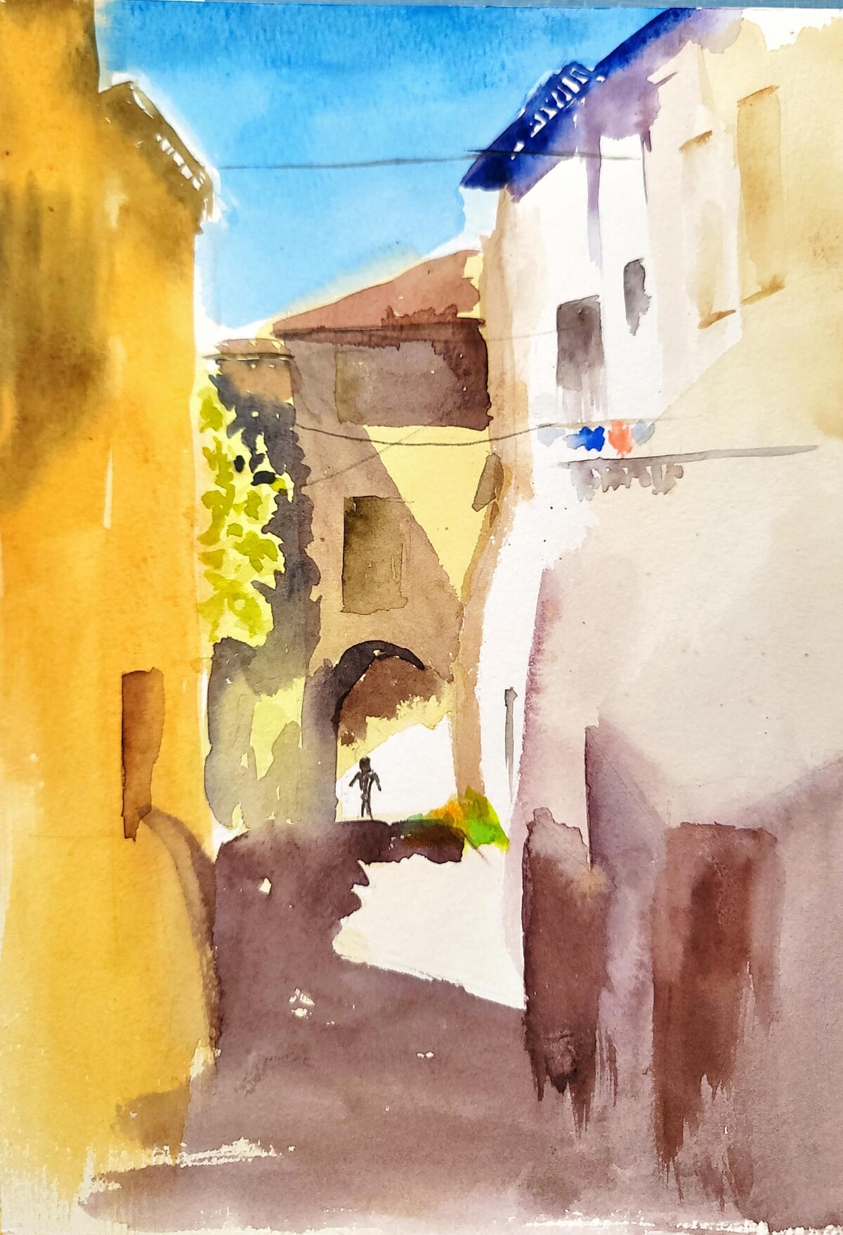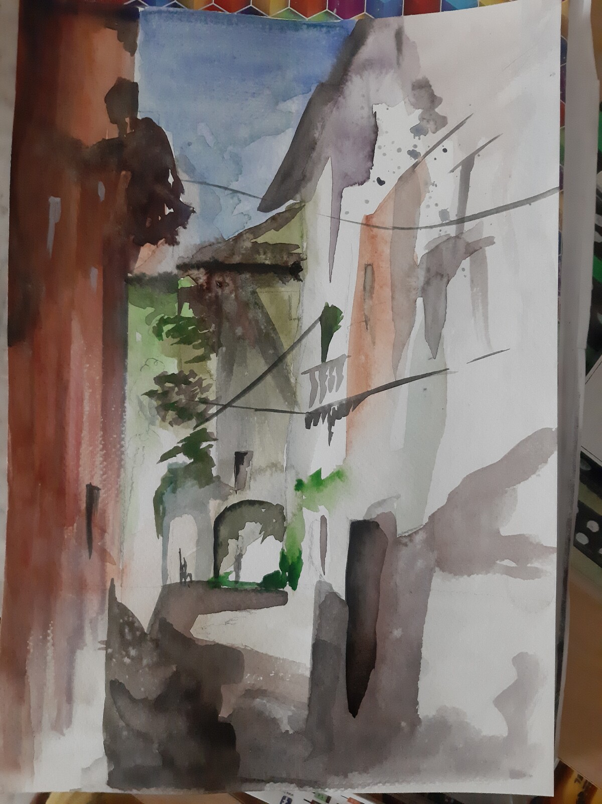 We will now challenge ourselves with an urban scene using the same principles of Notan to tackle it. We will explore tonal and colour relationships. We will learn how to add areas of detail for the viewer to make sense of a scene that may otherwise appear like abstract brush strokes.