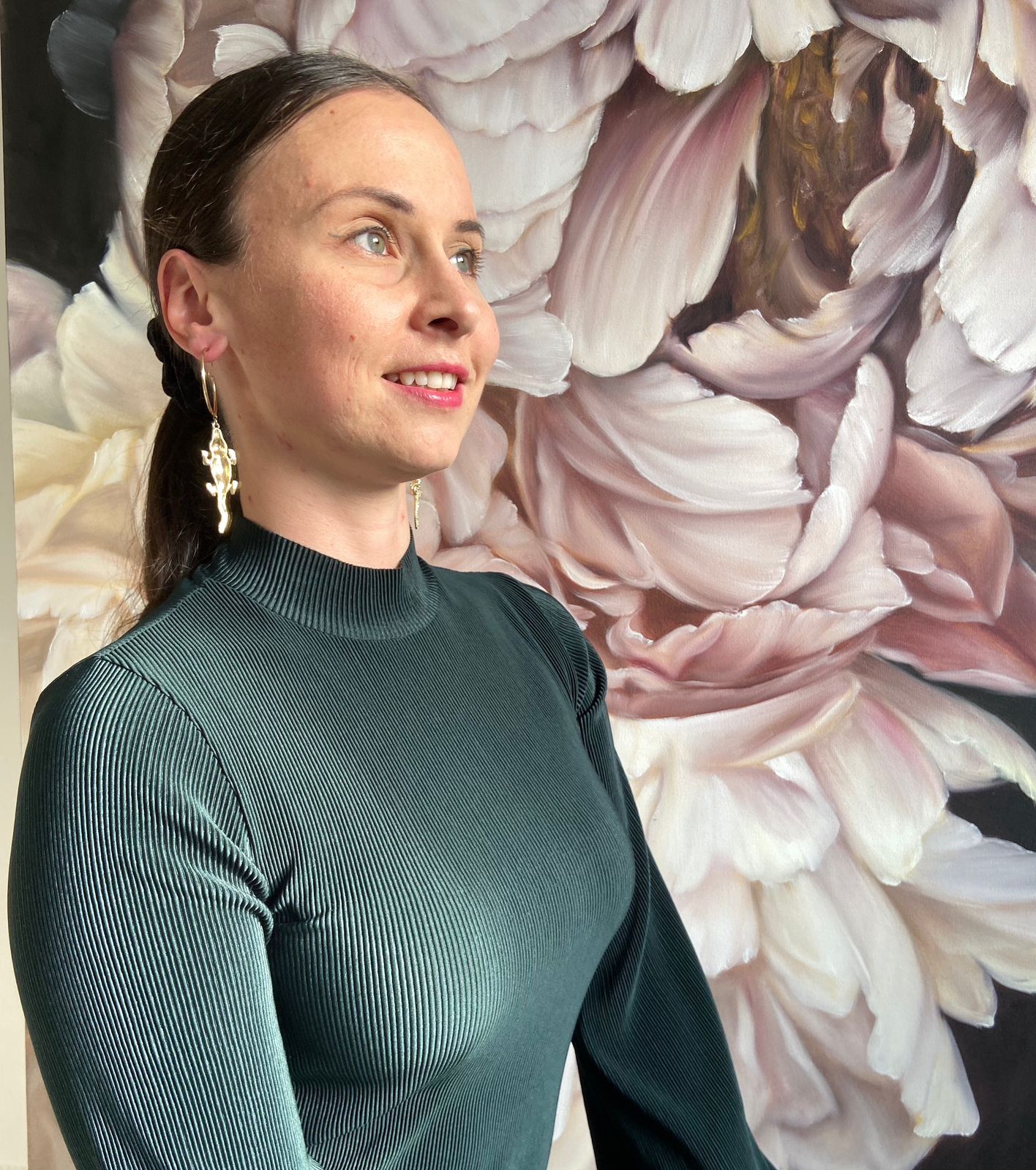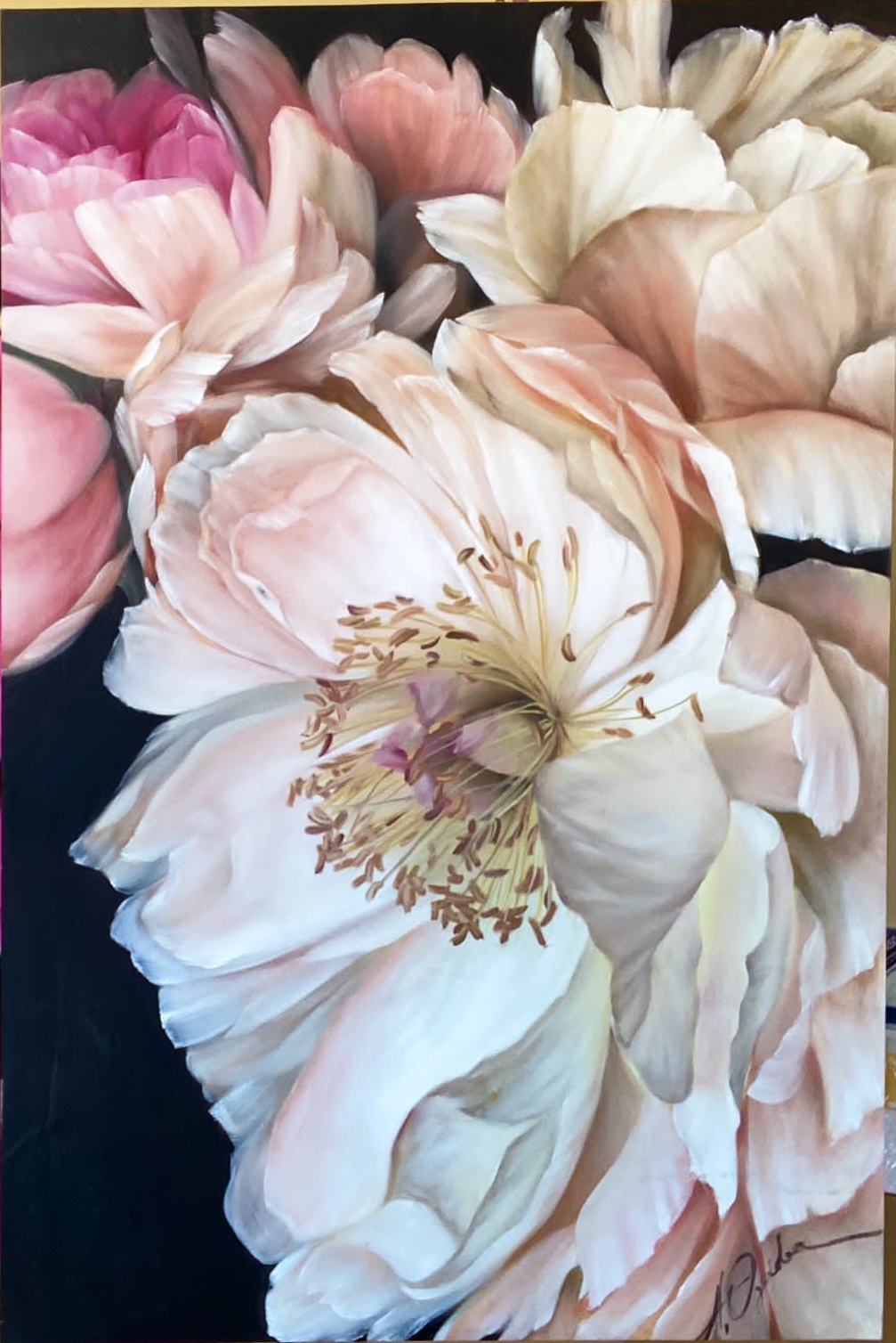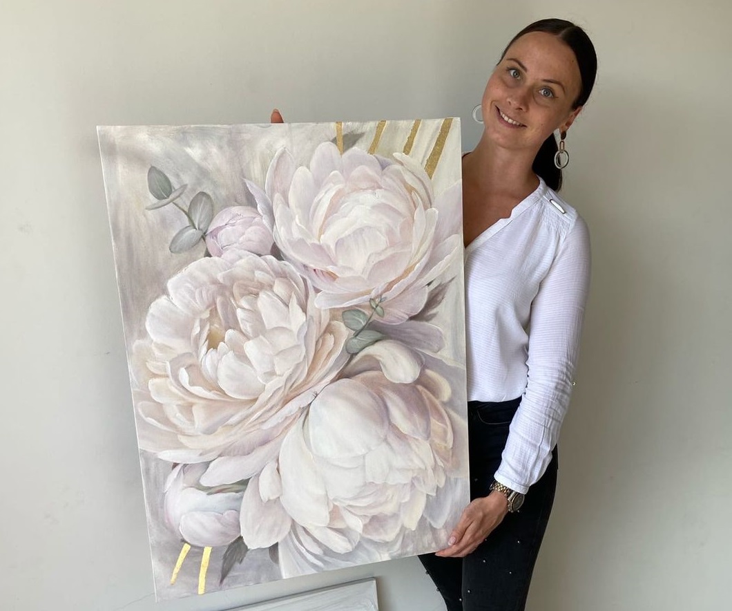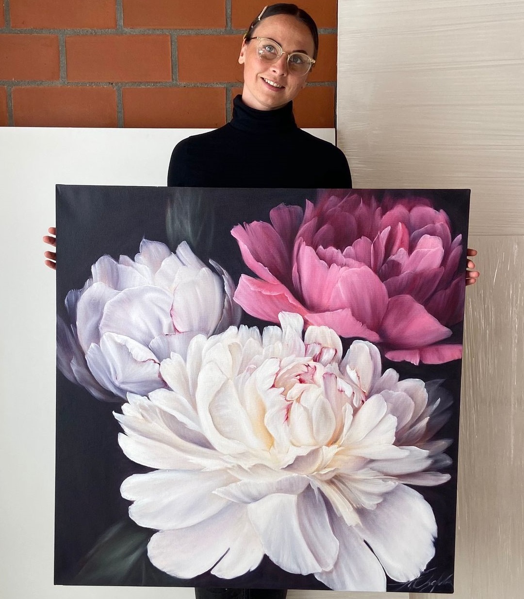 Создадите цветочную композицию с пионами на металлизированном акриловом фоне в стиле одной из самых знаменитых художниц современности - Клэр Баслер.