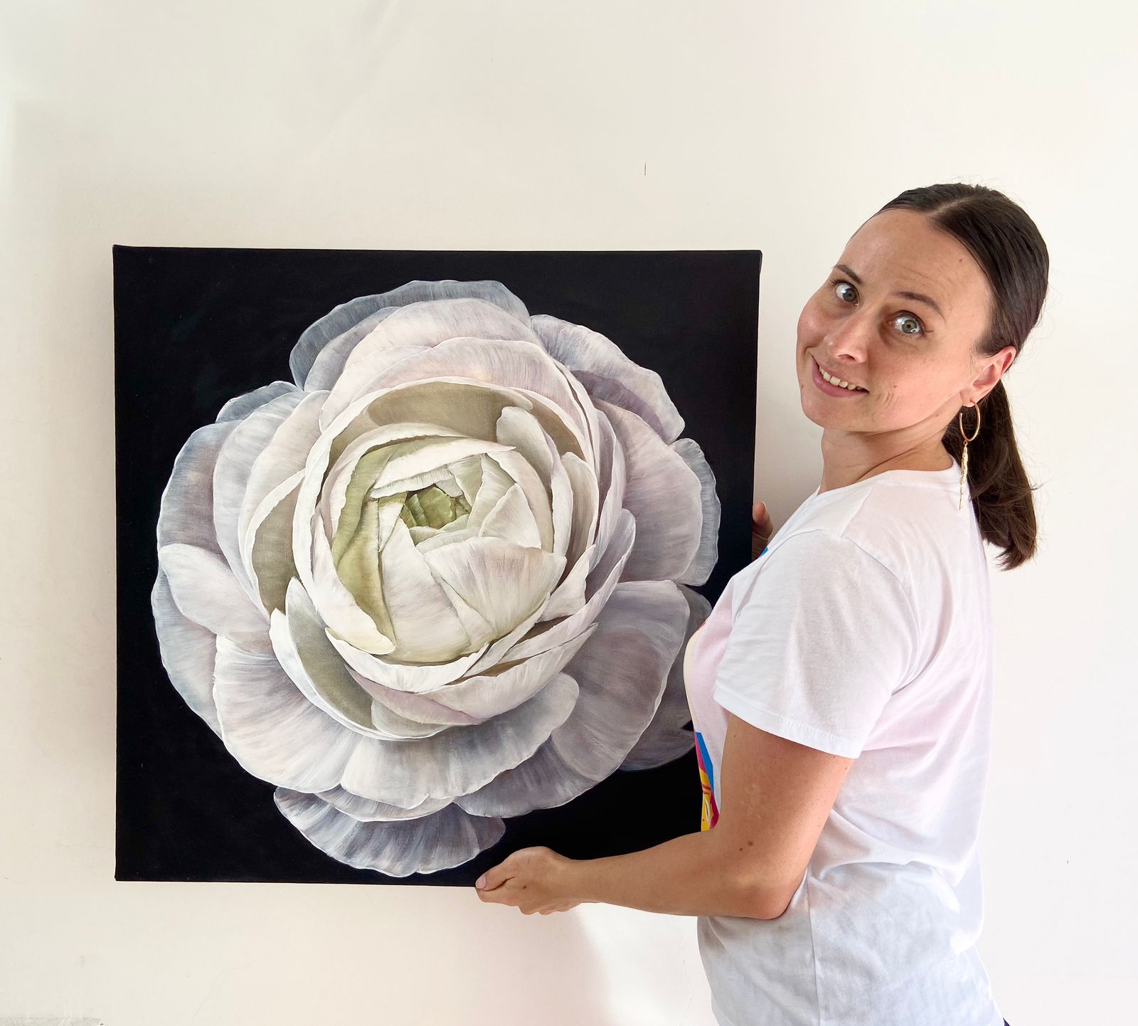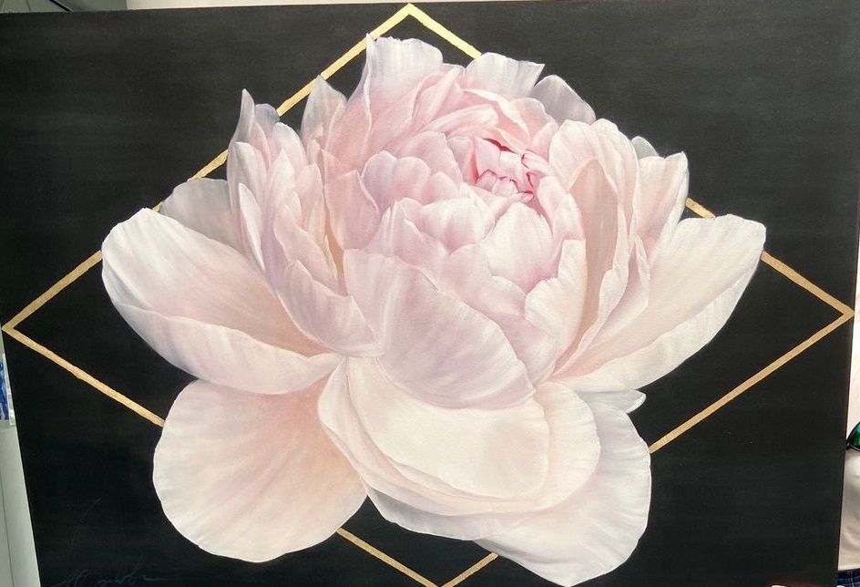Создадите цветочную композицию с пионами на металлизированном акриловом фоне в стиле одной из самых знаменитых художниц современности - Клэр Баслер.