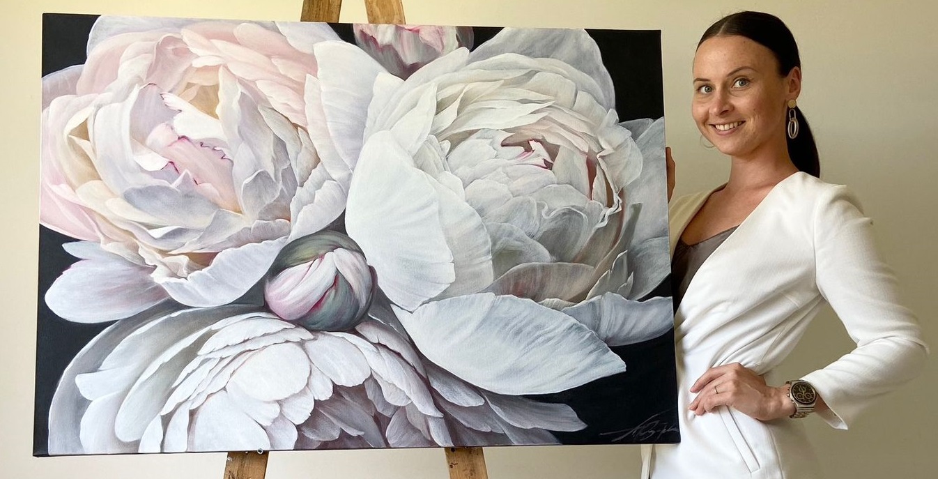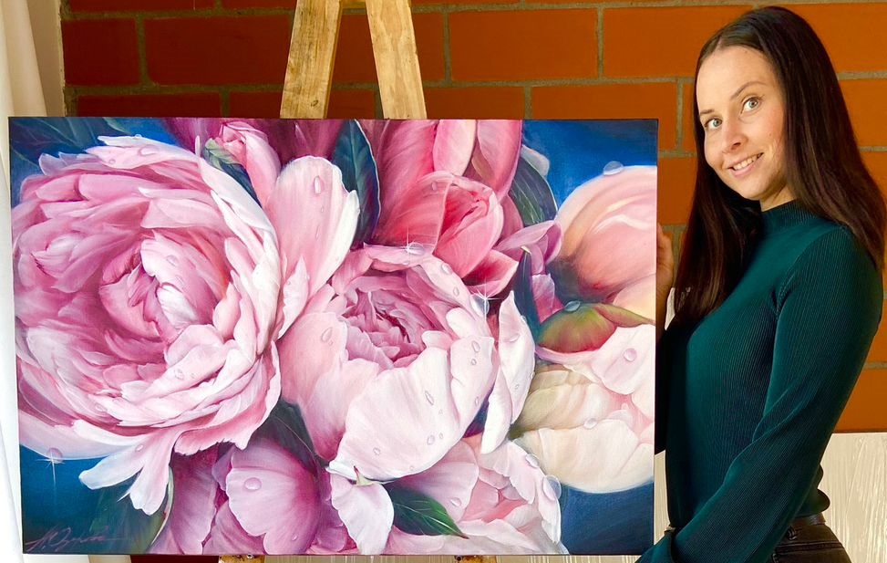 Создадите цветочную композицию с пионами на металлизированном акриловом фоне в стиле одной из самых знаменитых художниц современности - Клэр Баслер.