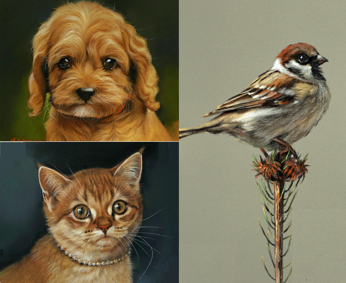 Нарисуете реалистичные портреты трех разных животных: воробья, кошки, щенка.