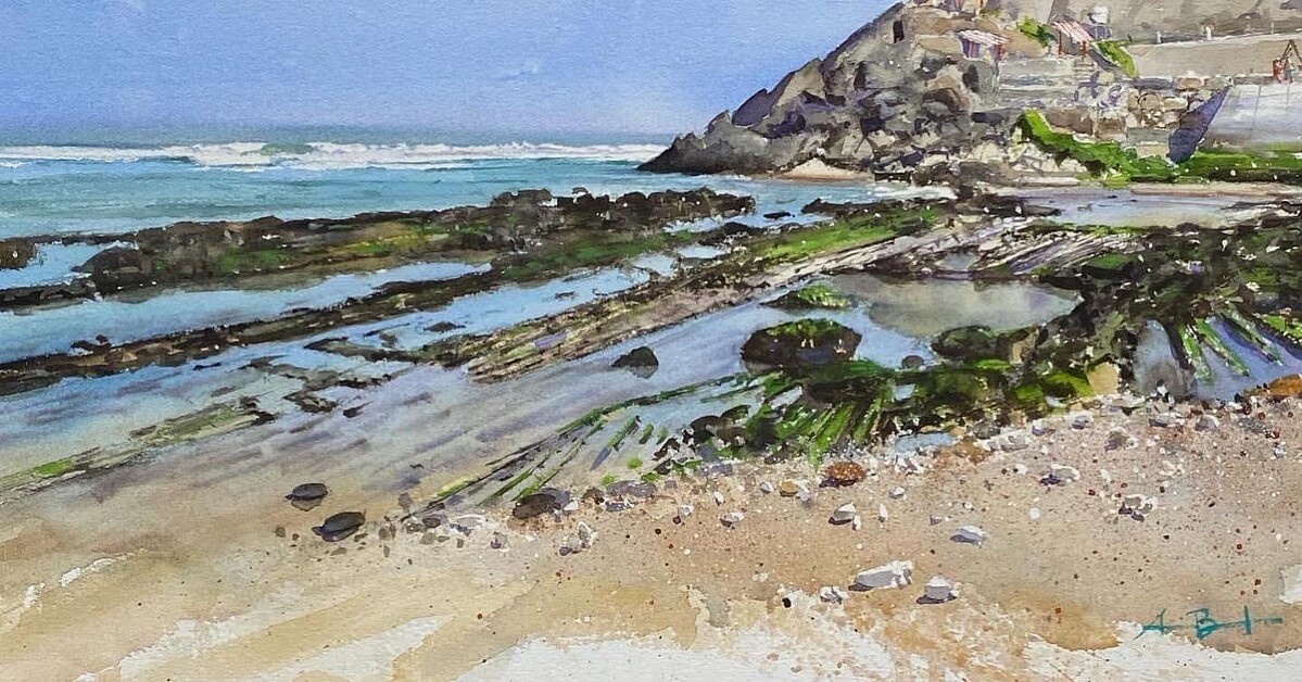 At this lesson, you will learn how to create a stunning seascape watercolor painting, inspired by the beautiful Santa Cruz Beach in Portugal. Antonio Bartolo will guide you through capturing light water movements, reflections, clear skies, and the majestic rock of this picturesque location.