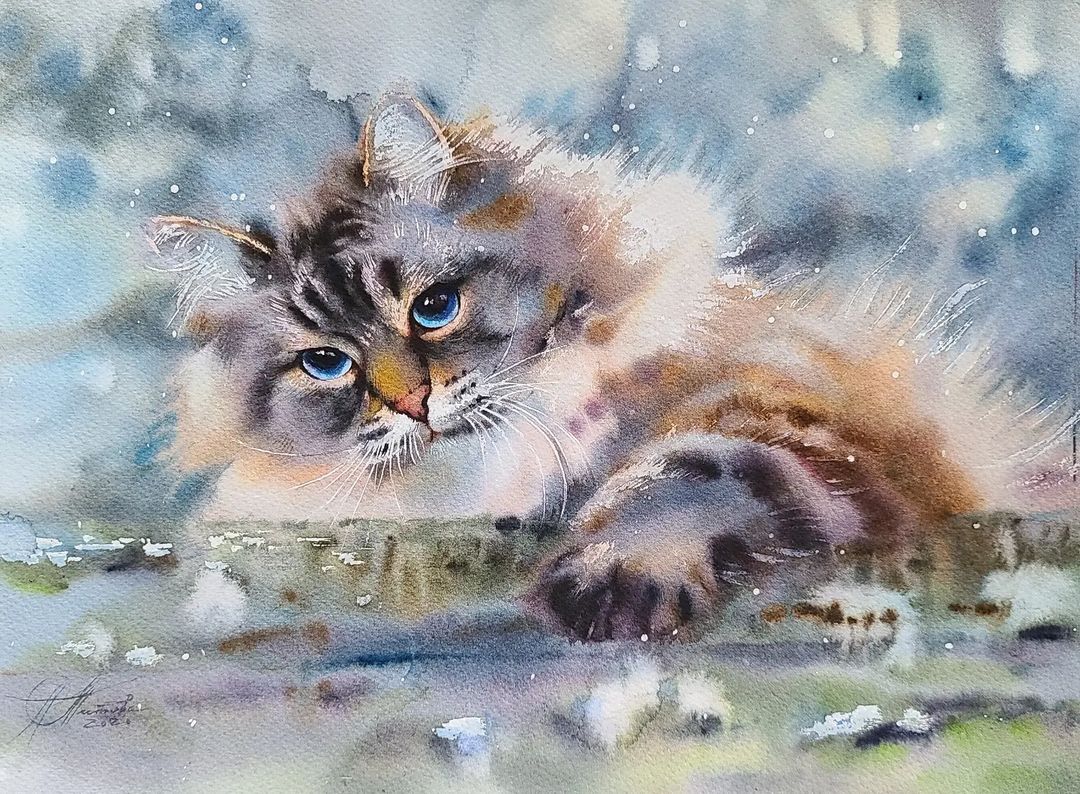 Совместите потрясающий реализм и эффектные акварельные приемы и напишите три выразительных кошачьих портрета вместе с Любовью Титовой