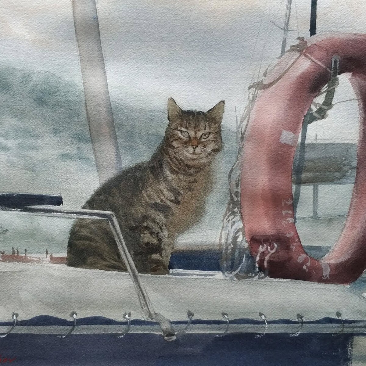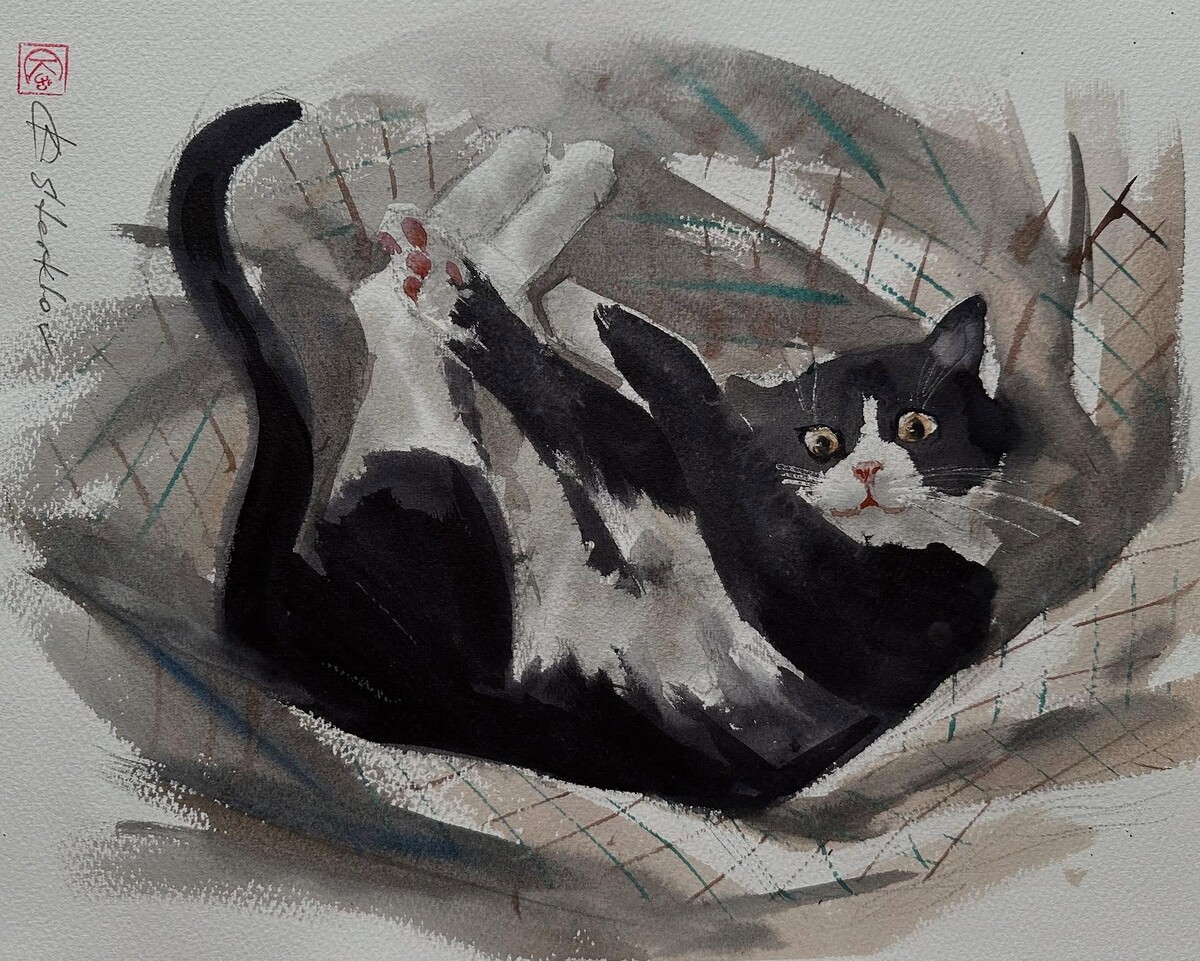 Учимся видеть «большую» форму, передавать текстуру и узор шерсти, увязывать фигуру кошки с фоном. Пишем без карандашного наброска сразу кистью.