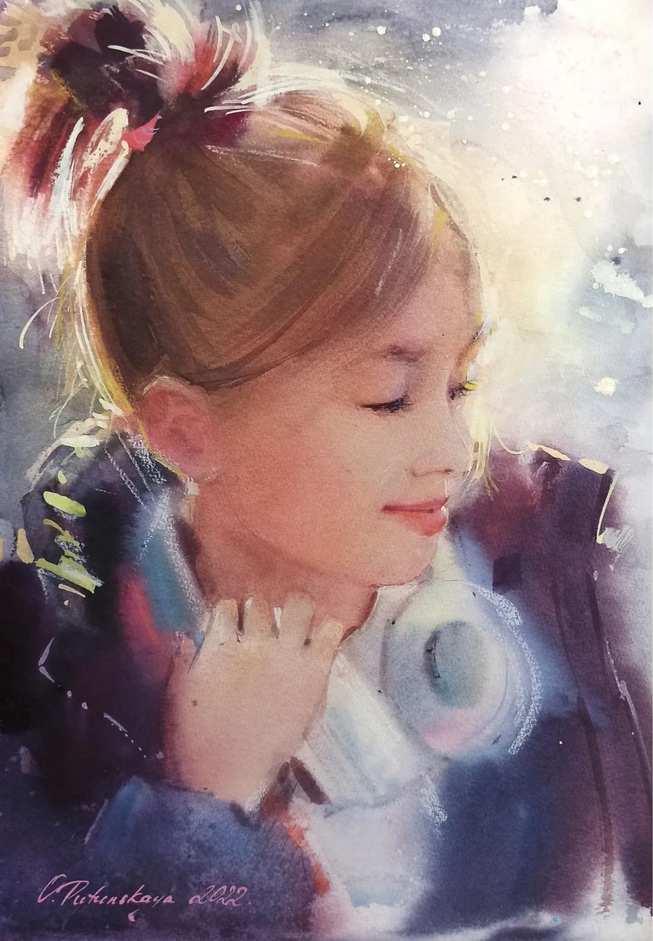 - В детском портрете Ольгу привлекают цвет, ореол, блики, полупрозрачности и яркие рефлексы. Художница мастерски использует тонкость и прозрачность акварели, рисуя лица детей. Она стремится к достоверности и в то же время не перегружает картины деталями