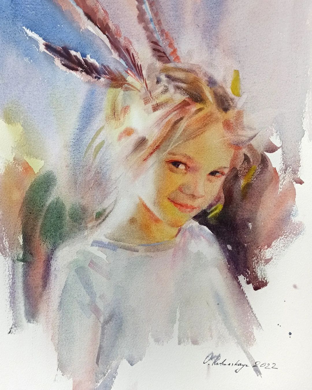 - В детском портрете Ольгу привлекают цвет, ореол, блики, полупрозрачности и яркие рефлексы. Художница мастерски использует тонкость и прозрачность акварели, рисуя лица детей. Она стремится к достоверности и в то же время не перегружает картины деталями