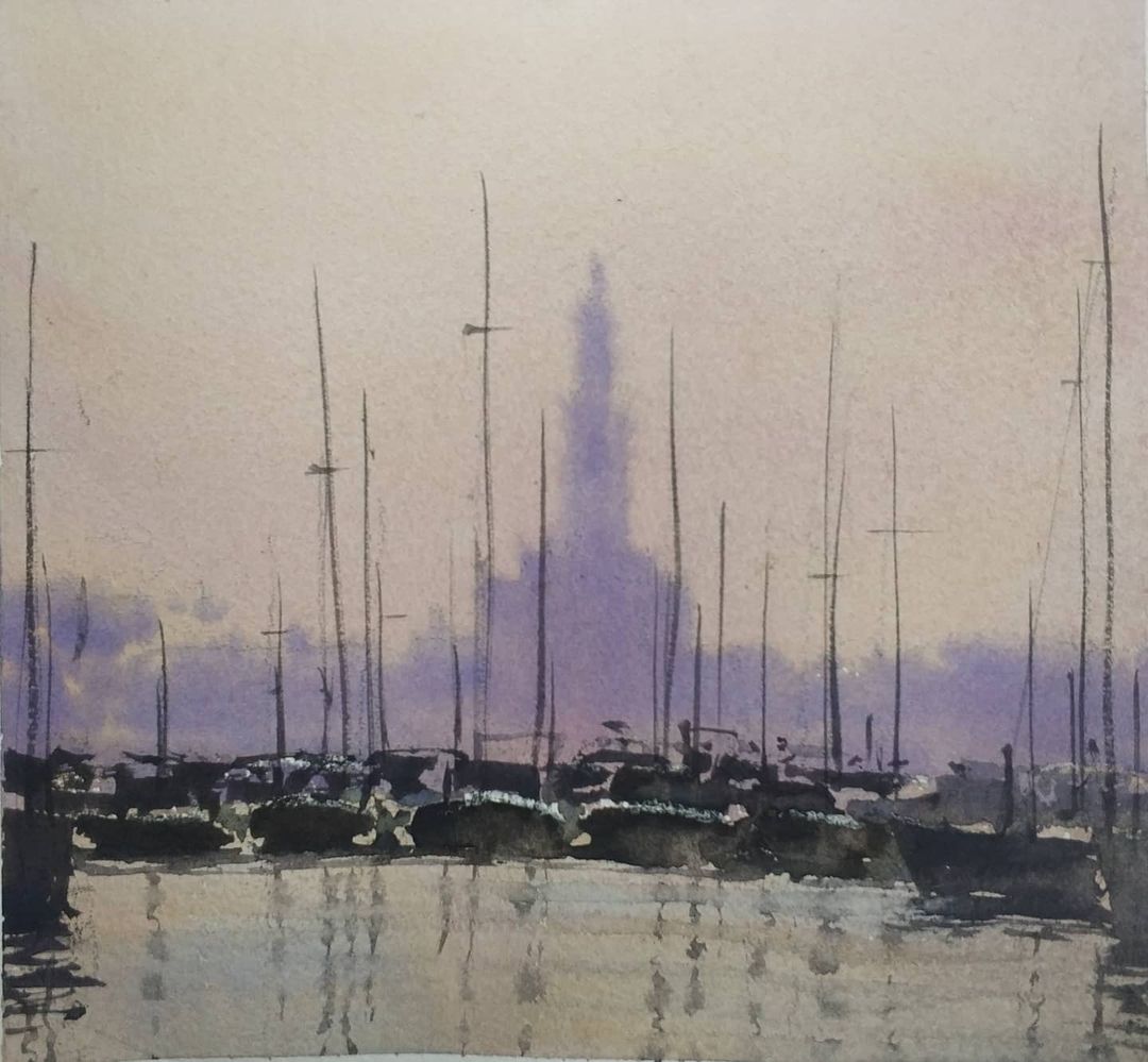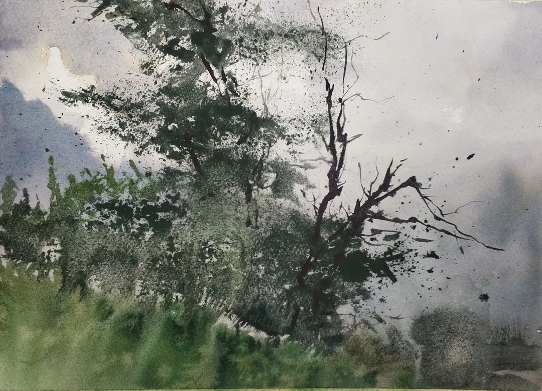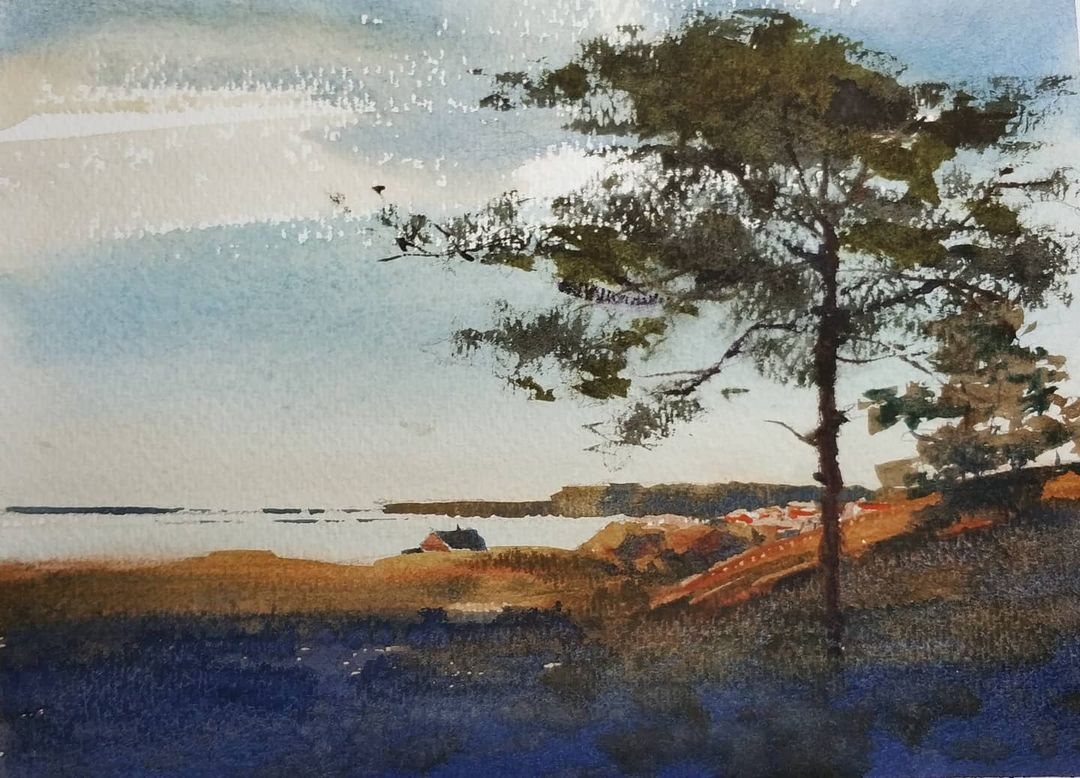 Научимся передавать воздушную перспективу, выделять тоном и текстурой центр интереса, использовать набрызгивание для расфокусировки края картины.