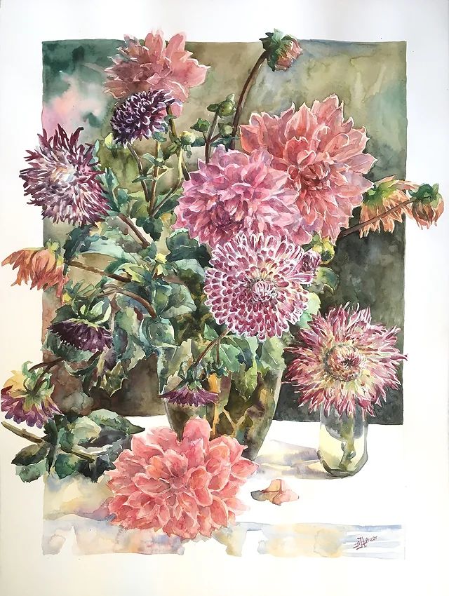Изучите строение цветка. Разберете, как скомпоновать много цветов, чтобы они не спорили между собой. Создадите красивую композицию из георгин.