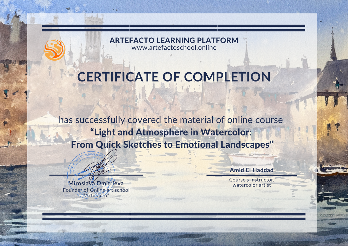 Upon completion of the course for the students of Premium and Elite plans we issue a certificate. The certificate could be used as a proof of your qualification's upgrade at work (if it is related to arts) and for your private affairs as a recognition of your mastery in painting.