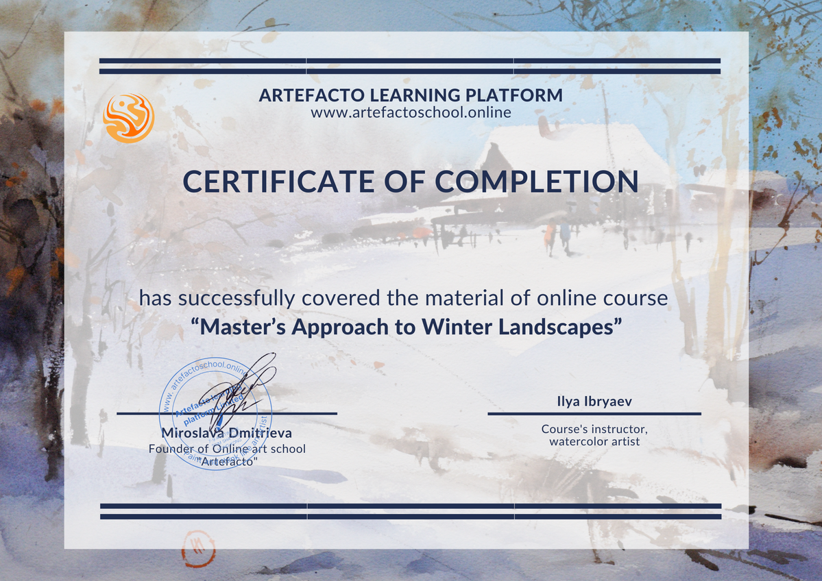 Upon completion of the course for the students of Premium plan we issue a certificate. The certificate could be used as a proof of your qualification's upgrade at work (if it is related to arts) and for your private affairs as a recognition of your mastery in painting.
