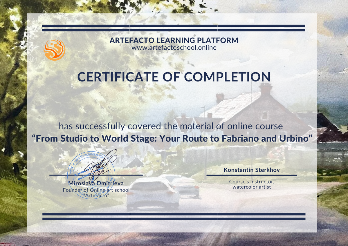 Under the personal mentorship of Konstantin Sterkhov — internationally acclaimed watercolor artist, curator, and exhibition juror — you’ll learn exactly how to prepare and apply for world-class exhibitions such as Fabriano and Urbino. In just 2 months, you’ll be ready to submit your own application.