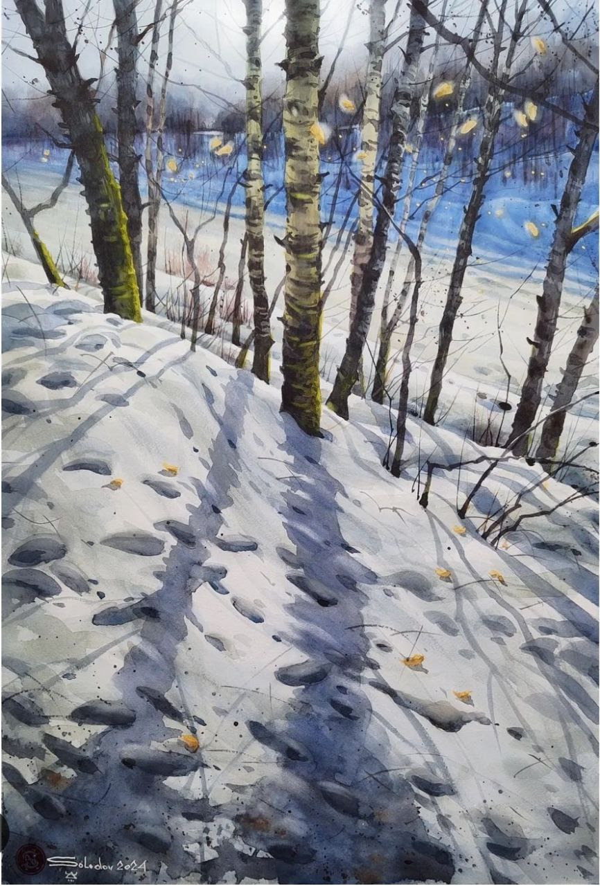 Научимся изображать солнечный февральский свет в полдень, разберемся в цветах и фактуре снега, а также выясним, как свет влияет на цвет рефлексов.