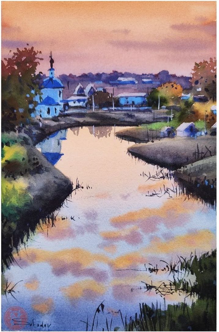 Научимся изображать летний, знойный свет, сфокусируемся на рисовании глади воды с отражениями, а также разберем методы построения и придания глубины сцене.