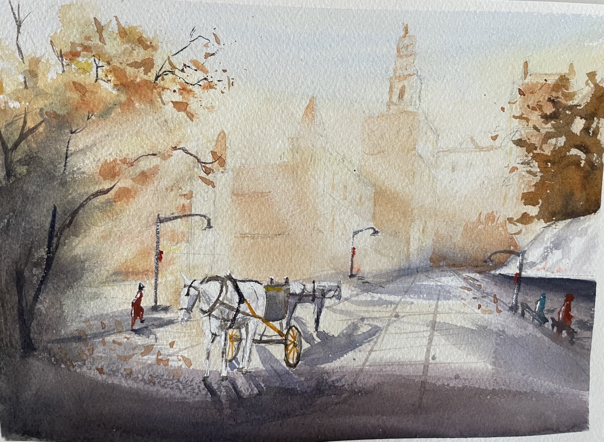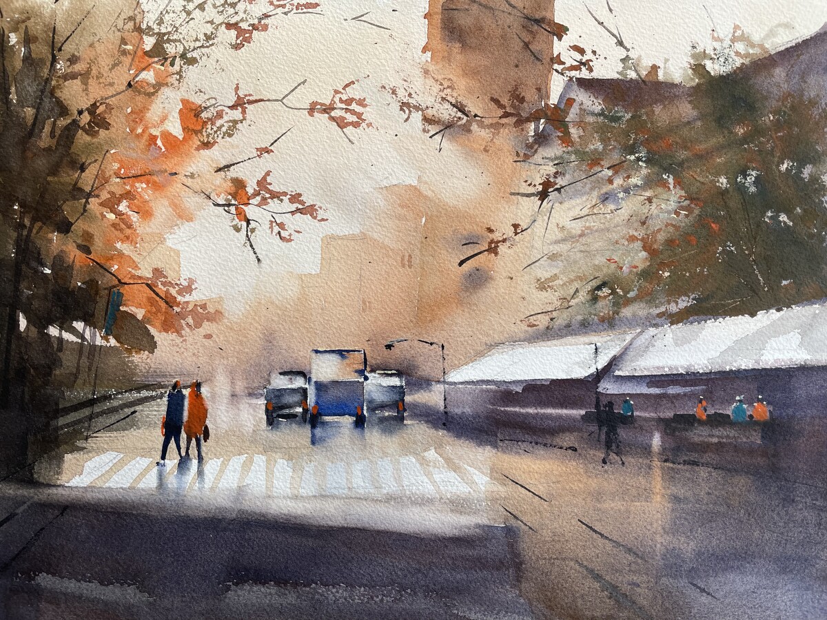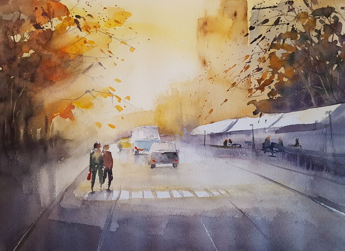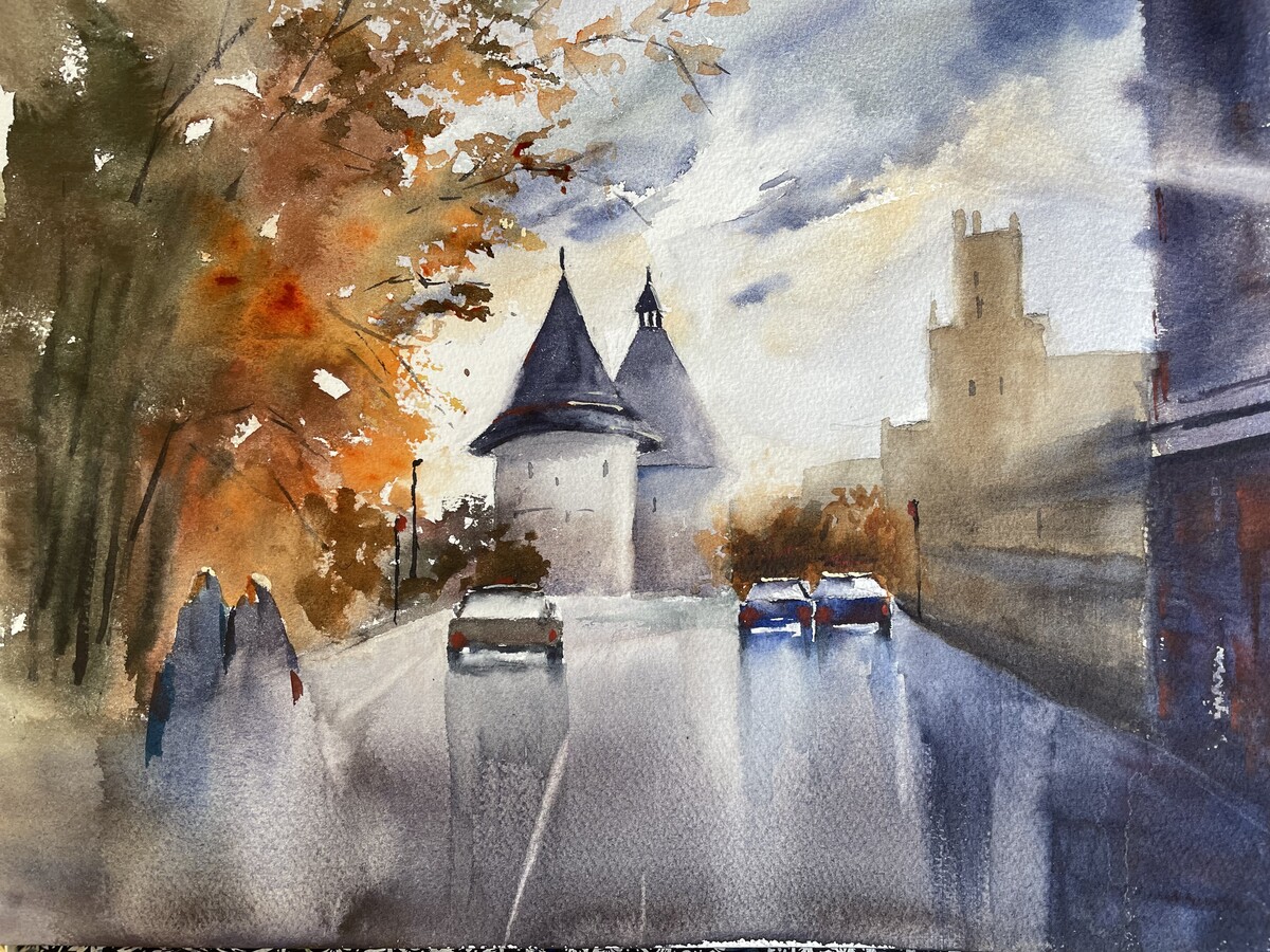 We will train to make contrasts, paint a cityscape after rain, add bright color accents, and practice using linear and aerial perspective.