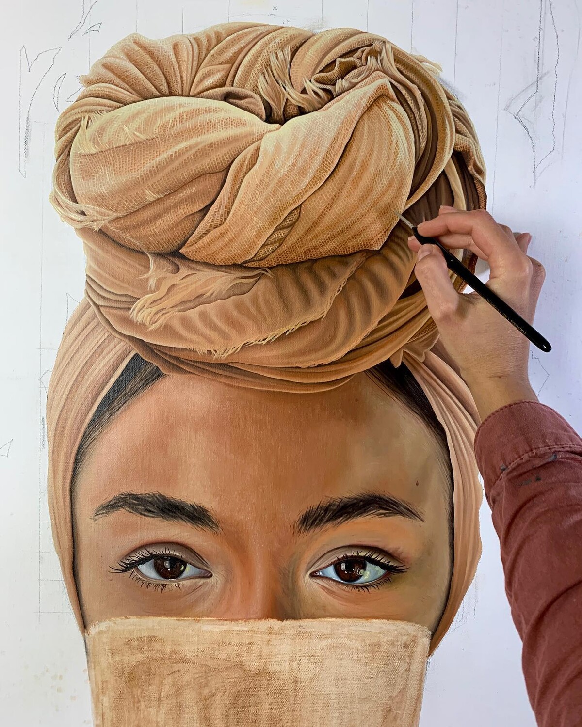 Learn how to paint the first layer, portraying face, hair, scarf, and background.