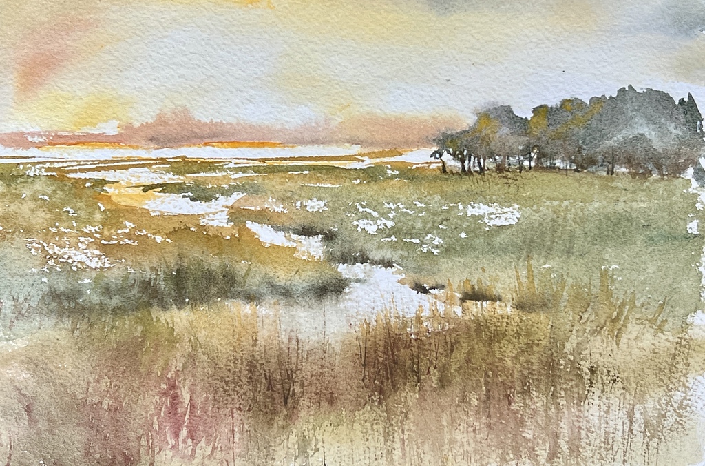 Learn to define and regulate the paper wetness, see how wet the paper should be for different results, and practice controlling water and pigment on paper. Create a small landscape using 4 stages of wetness in different areas.