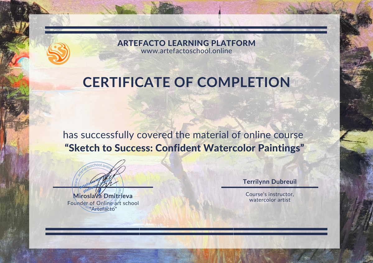 Upon completion of the course for the students of Premium plan we issue a certificate. The certificate could be used as a proof of your qualification's upgrade at work (if it is related to arts) and for your private affairs as a recognition of your mastery in painting.