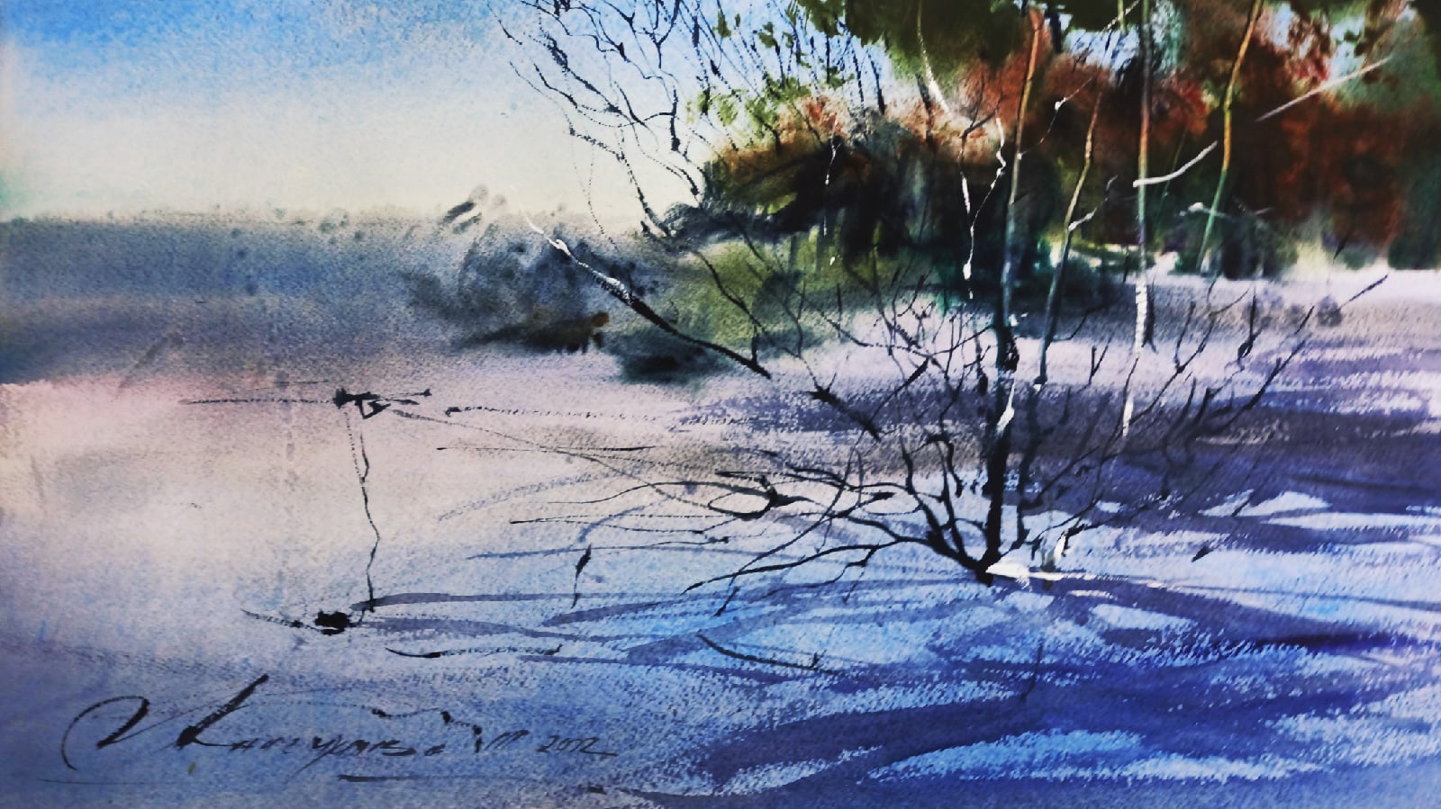 На этом уроке мы выполним минимальным количеством цветов (всего 3 пигмента) полноценный зимний этюд. Изучим более сложную композицию и большее количество предметов в сюжете.