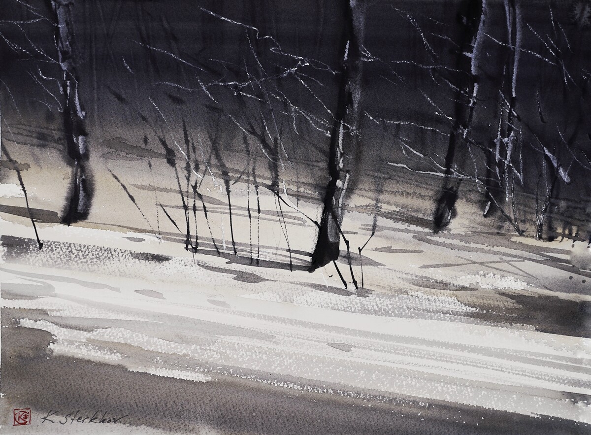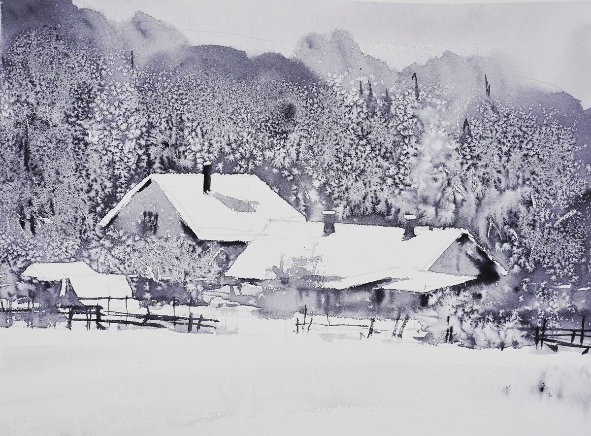 Зима — это идеальное время для того, чтобы понять тональные отношения. Что светлее, что темнее, насколько разнообразен серый цвет, как вывести объект вперед или увести назад? Все это будем изучать на примере зимнего пейзажа, когда можно очень легко исключить цвет и при помощи лишь одной краски можно создать восхитительное графическое произведение.
