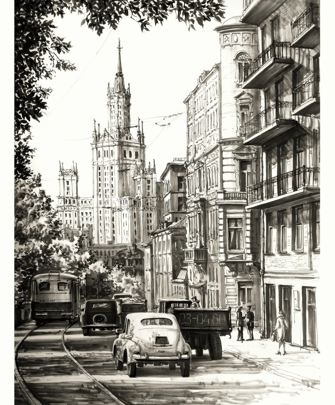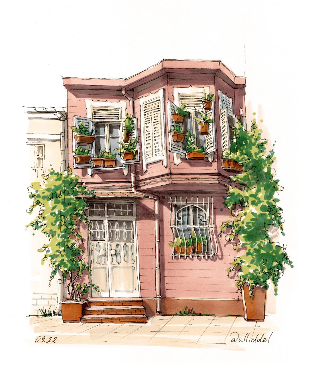- Специализируется в городских зарисовках маркерами и акварелью. Рисует город во всех его проявлениях: от парадной архитектуры до проводов и подворотен, от узких улочек до воздушных панорам.