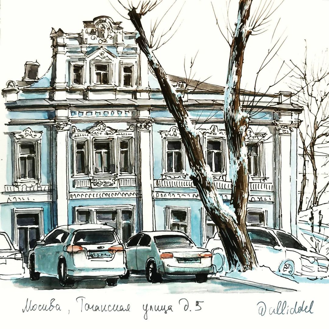 - Специализируется в городских зарисовках маркерами и акварелью. Рисует город во всех его проявлениях: от парадной архитектуры до проводов и подворотен, от узких улочек до воздушных панорам.