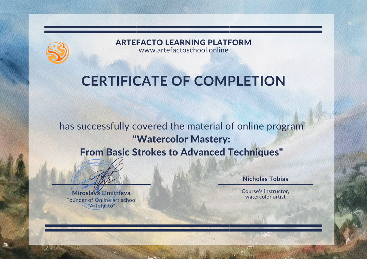 Join Nicholas Tobias' program for a rich, 6.5-hour watercolor journey. Progress from beginner to confident artist, culminating in a diverse portfolio of 5 paintings.