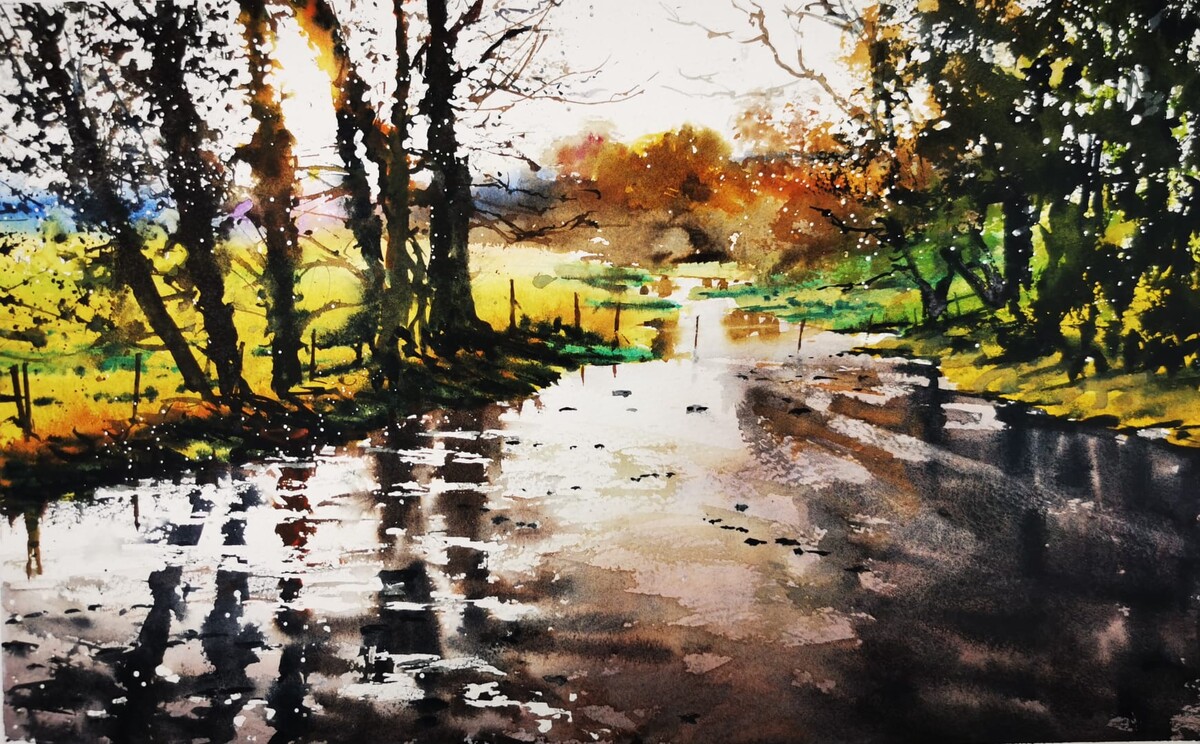 - Paint a sunlit river scene with reflections, distant trees, and glowing water